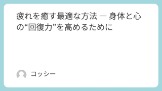 1. はじめに ― 疲れは“自然なサイン”である私たちは日々、仕事や家事、人間関係、情報の洪水など、さまざまな負荷の中で生きています。「疲れたな……」と感じる瞬間があるのは、とても自然なことです。むしろ“疲れを感じること”は、身体と心が正し...